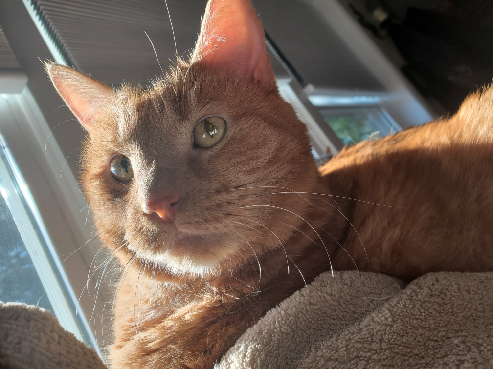 Rufus was a one-of-a-kind kitty with an attitude to match. We adopted him in July 2020 when he was 14 years old. We were forewarned that he did not get along with any cats and that he wasn’t friendly and had been returned twice before and was facing being put down if returned again. We knew we had to bring him home, there was no option and we were determined that with love and patience he would come around. We were not prepared for how much beefy love this 18lb kitty had. After a long 6 months, he would come out and socialize with the other kitties…at a distance of course. Soon he began to accept head cleanings from one of our other cats and started to play with his other adopted siblings. He started to feel comfortable and even started to let others (aside from my husband and myself) pet him.